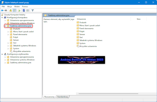 Wpisujemy w okno "gpedit.msc", zatwierdzamy "Enterem" lub "OK" . Po otwarciu edytora przechodzimy w "Konfigurację komputera" i dalej w "Szablony administracyjne".